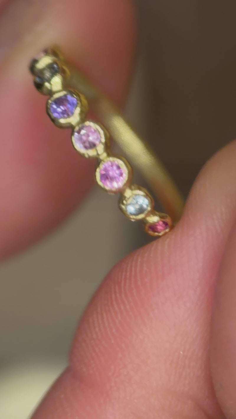 A delicate band set with a soft procession of sapphires, each different in tone and character. Pastel pinks melt into lilac and blue, creating a subtle rhythm of colour that feels organic rather than uniform.