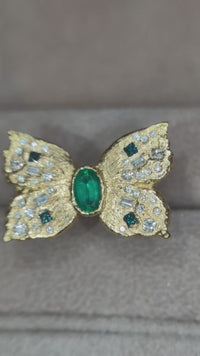 Enhancing the butterfly's elegance on the wings are shimmering and sparkling white and blue diamonds, meticulously set to create a dazzling contrast against the gold and the emerald. The white diamonds add a brilliant sparkle, while the blue diamonds introduce a unique pop of color, reminiscent of the sky.